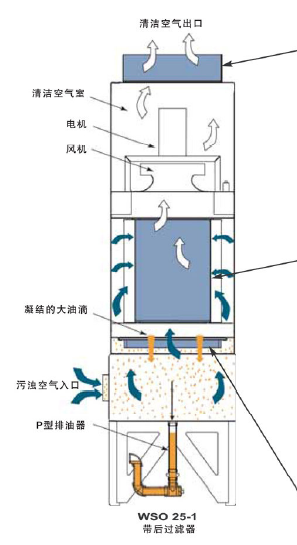 含油霧或冷卻液的氣體通過管道進入油霧凈化器內,首先經過一級金屬過濾網過濾大的油滴和液滴;再進入二級過濾棉,過濾除去中等粒徑的油霧和冷卻液;剩余下很細小的油霧和冷卻液進入濾筒過濾,由濾筒中心流入潔凈室后經出風口排出。濾筒對細小的油霧有較高的過濾效率,從而達到凈化油霧的作用。可更完全地回收和處理冷卻液及機油。
