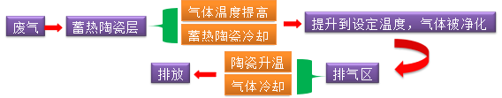 在工業(yè)生產(chǎn)過程中,排放的有機(jī)尾氣通過引風(fēng)機(jī)進(jìn)入設(shè)備的旋轉(zhuǎn)閥,通過選轉(zhuǎn)閥將進(jìn)口氣體和出口氣體完全分開。氣體首先通過陶瓷材料填充層(底層)預(yù)熱后發(fā)生熱量的儲(chǔ)備和熱交換,其溫度幾乎達(dá)到催化層(中層)進(jìn)行催化氧化所設(shè)定的溫度,這時(shí)其中部分污染物氧化分解;廢氣繼續(xù)通過加熱區(qū)(上層,可采用電加熱方式或天然氣加熱方式)升溫,并維持在設(shè)定溫度;其再進(jìn)入催化層完成催化氧化反應(yīng),即反應(yīng)生成CO2和H2O,并釋放大量的熱量,以達(dá)到預(yù)期的處理效果。經(jīng)催化氧化后的氣體進(jìn)入其它的陶瓷填充層,回收熱能后通過旋轉(zhuǎn)閥排放到大氣中,凈化后排氣溫度僅略高于廢氣處理前的溫度。系統(tǒng)連續(xù)運(yùn)轉(zhuǎn)、自動(dòng)切換。通過旋轉(zhuǎn)閥工作,所有的陶瓷填充層均完成加熱、冷卻、凈化的循環(huán)步驟,熱量得以回收。